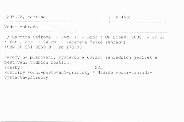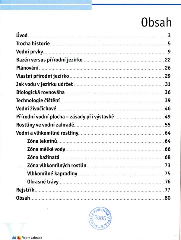 Vytvoření vodních ploch v okrasných zahradách není náročné ani nákladné. Kniha přináší praktické informace a zásady při výstavbě různých vodních nádrží a prvků (vodopády, zřídla, pítka). Poradí při údržbě, výběru vodních živočichů. Samostatná kapitola je věnována vodním a bahenním rostlinám, které se musí vybrat podle specifických požadavků na pěstování (velikost vodní plochy, hloubka, proudící nebo klidná voda). Text doplňují barevné fotografie.