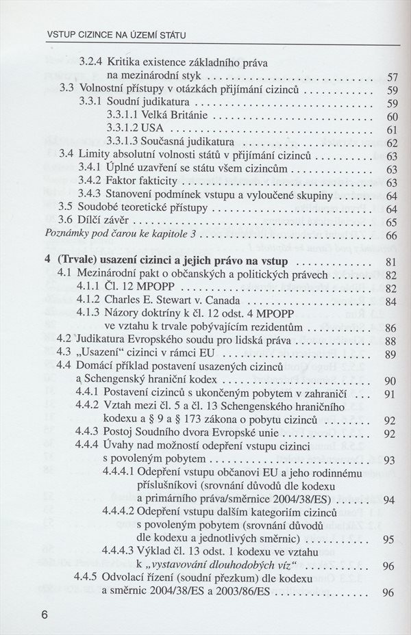 Monografie vyvrací názor o absolutní volnosti států v otázkách rozhodování o přijetí cizinců na vlastním území. Práce nahlíží na tuto problematiku z hlediska mezinárodního, evropského i českého práva.