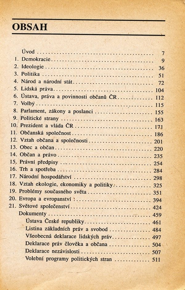 Soubor obsahuje množství beletristických textů, novinových článků, úryvků ze studií i některé dokumenty, které jsou seskupeny do větších celků podle jednotlivých tématických okruhů. Jde např. o otázky demokracie, politiky, lidských práv, voleb, politických stran aj. Na závěr jsou připojeny důležité dokumenty - Ústava ČR, Listina základních práv a svobod, Všeobecná deklarace lidských práv aj.