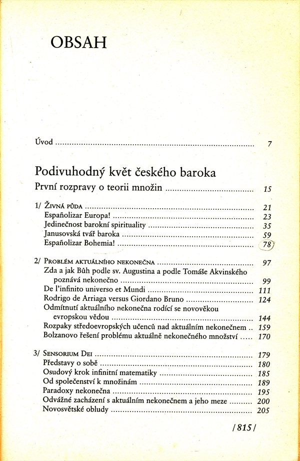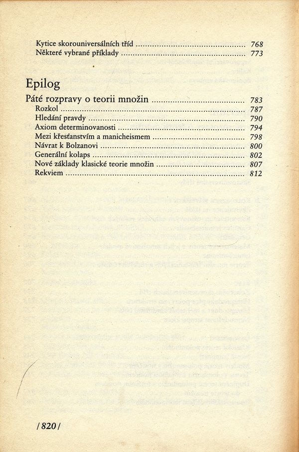 První kniha přibližuje spory teologů a vědců o existenci aktuálního nekonečna. Následující část pojednává o Cantorově výstavbě nekonečných ordinárních a kardinálních čísel z posledních desetiletí devatenáctého století. Třetí kniha se zabývá vývojem matematiky založené na existenci aktuálně nekonečných množin. Předposlední se věnuje poválečnému vývoji teorie množin až do začátku sedmdesátých let dvacátého století. Epilog obsahuje úvahy o problému pravdy v oboru aktuálně nekonečných množin.