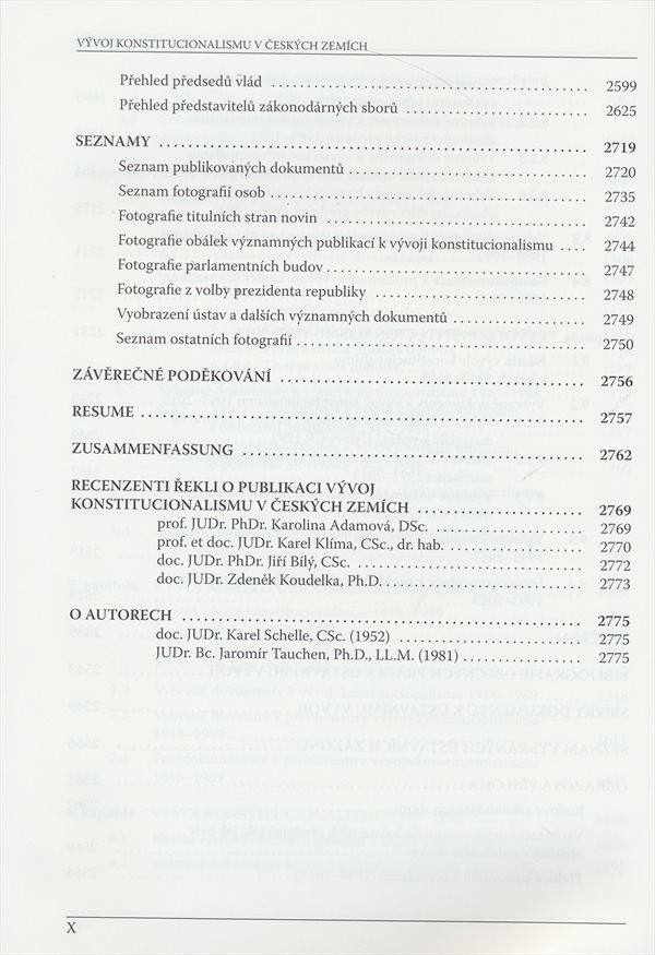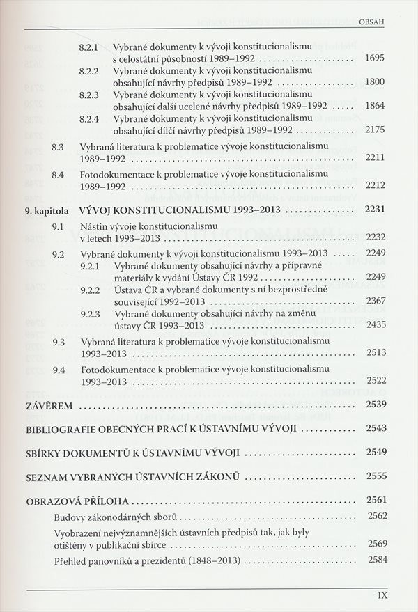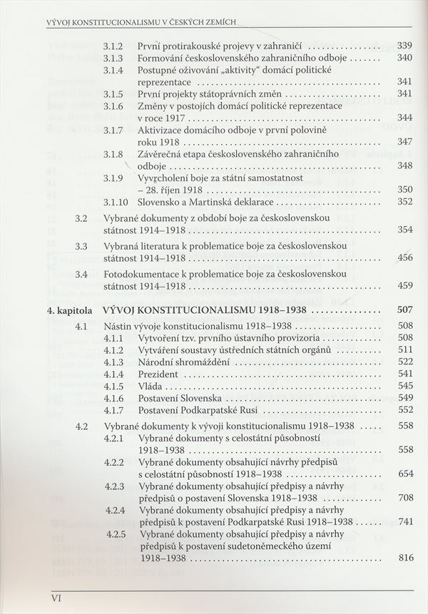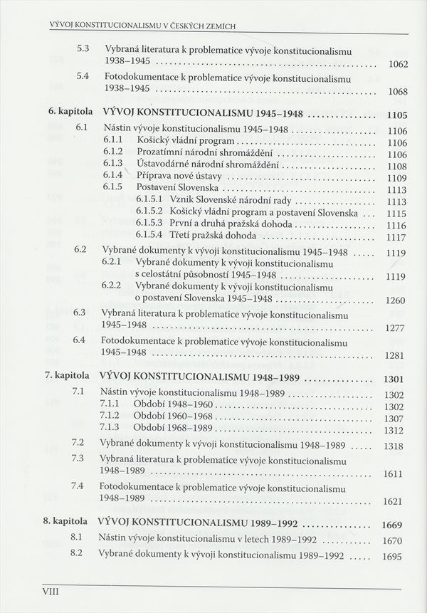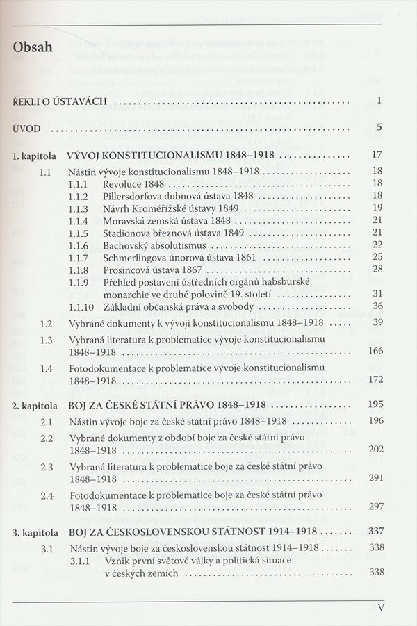 Kapitoly popisují ústavní vývoj v českých zemích v letech 1848-1948. Kromě výkladu obsahuje monografie texty ústav a jiných dokumentů.