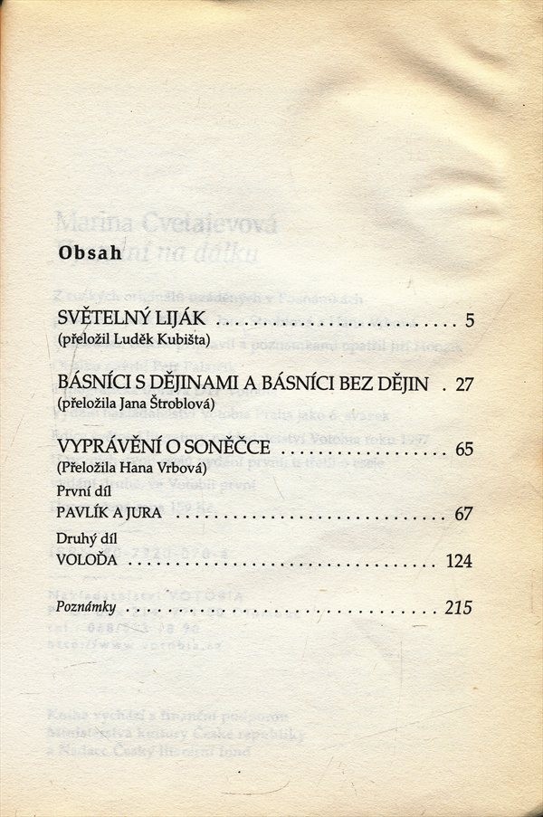 | Autor | Marina Cvetajevová ; uspoř., ed. připr. a pozn. opatř. Jiří Honzík ; z rus. originálů přel. Luděk Kubišta, Jana Štroblová, Hana Vrbová |