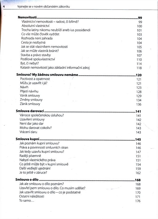 V průběhu následujícího roku má vstoupit v platnost nový občanský zákoník, z něhož vychází i tato kniha. Autoři se snaží o vysvětlení různých souvislostí a problémů (právnické osoby, ochrana osobnosti, manželství, dědění, rodičovství, nemovistosti, různé typy smluv, nájmy bytu, náhrada škody nebo bezdůvodné obohacení) prostřednictvím krátkých příkladů. Text vychází z právního stavu k 31. 3. 2013. Slovníček odborných pojmů.