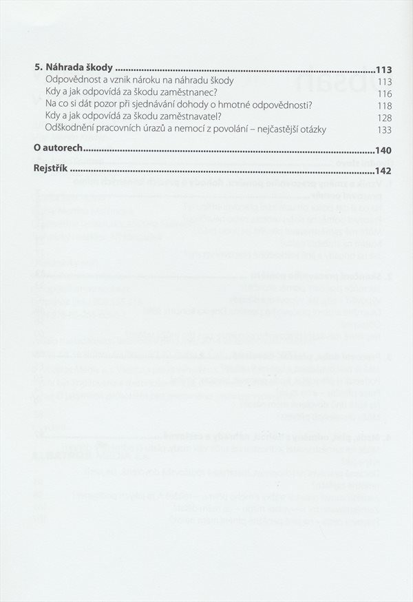 Obsahuje výklad těchto témat: vznik, změna a skončení pracovního poměru, pracovní doba a dovolená, mzda, plat, odměny, náhrada škody. Doplněno otázkami, odpověďmi a konkrétními příklady.