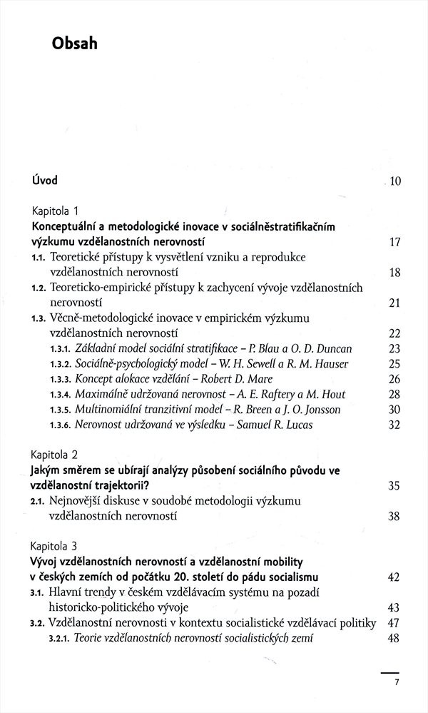 Autorka se pokouší vysvětlit, proč se zde navzdory proměňujícímu se historickému kontextu nerovnosti v přístupu ke vzdělání nemění a jsou z dlouhodobé perspektivy stabilní, a to i po roce 1989. Vychází z dosud publikovaných zjištění o přístupu ke vzdělání v České republice a propojuje tak existující poznatky s vlastní mobilitní analýzou mezigeneračního přenosu dosaženého vzdělání v rodině. Obsah knihy patří mezi trvale žhavá témata sociologie nerovností a sociální stratifikace. Nakladatelská anotace. Kráceno.