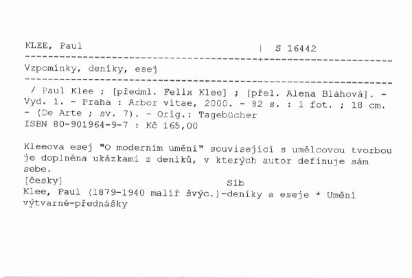 Kleeova esej "O moderním umění" související s umělcovou tvorbou je doplněna ukázkami z deníků, v kterých autor definuje sám sebe.