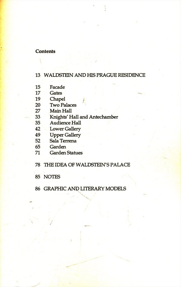 Stručný průvodce po Valdštejnském paláci v angličtině popisuje palácové průčelí, jednotlivé sály v paláci, sallu terrenu a sochy v zahradě. Autor věnuje největší pozornost výtvarné výzdobě jednotlivých sálů, zvláště nástěnným a nástropním malbám. Podrobně jsou rozebírány náměty a motivy jednotlivých maleb, jejich původní antický i nově přenesený význam. Ze zahrady je největší pozornost opět věnována výzdobě sally terreny a dále sochám de Vriese. Brožura je vybavena nákresy jednotlivých nástěnných maleb a architektonických prvků a dispozičními plánky.