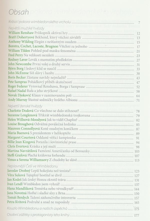 Osobní příběhy, překonávání překážek a náročná cesta k vítězství. Jaké bylo jejich účinkování na nejslavnějším a nejstarším turnaji světa Wimbledonu? Jakými úskalími si musely v životě i v tenisu projít? Nejzajímavější okamžiky jsou navíc zdokumentovány unikátními fotografiemi z wimbledonské trávy, které čeští čtenáři dosud neviděli! Nakladatelská anotace. Kráceno.