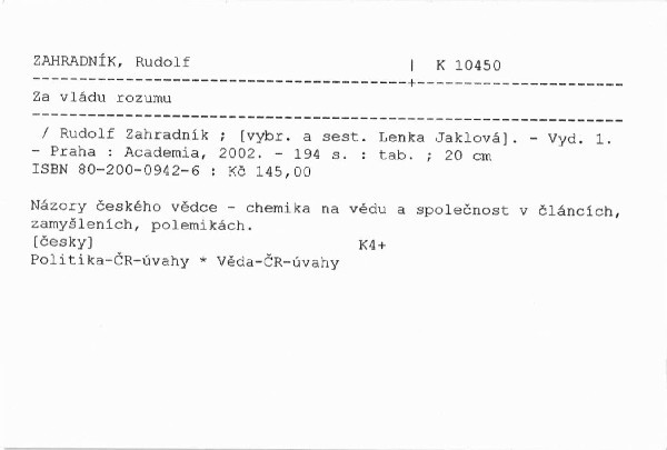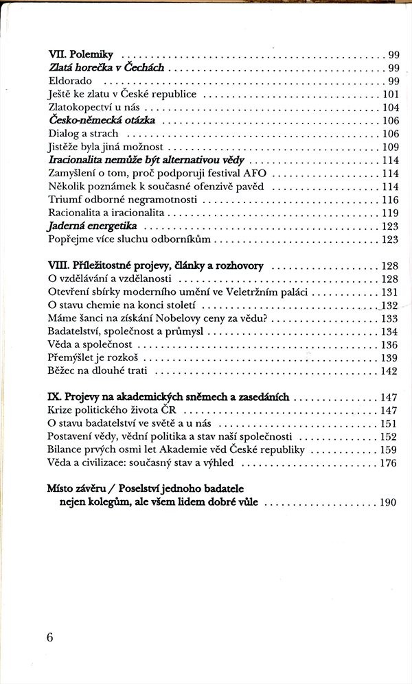 Knížka nám představuje názory předního českého vědce, Prof. Ing. Rudolfa Zahradníka, bývalého předsedy Akademie věd ČR. Publikace je složena z drobných útvarů - článků, projevů, polemik, zamyšlení na různá témata. Autor nepíše jenom o vědě a její úloze či situaci v dnešní společnosti a v historii, ale rozebírá i jiná témata, například politická nebo všeobecně společensko - kulturní. Máme tak možnost nahlédnout do myšlenek předního českého fyzikálního chemika, odborníka, který zároveň píše i populární články a zamyšlení. N2c1 sosnovcj