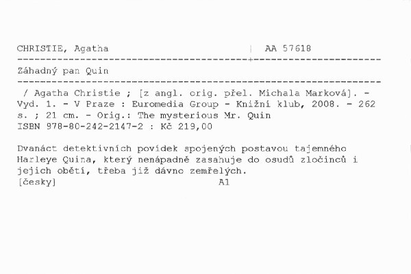 Dvanáct detektivních povídek spojených postavou tajemného Harleye Quina, který nenápadně zasahuje do osudů zločinců i jejich obětí, lidí živých i dávno zemřelých.