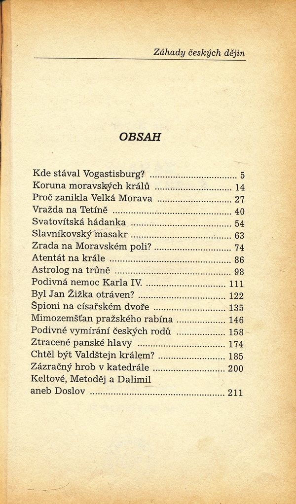 Vlastní úvahy nad záhadami spojenými většinou se životem významných osobností českých dějin porovnává autor s názory odborníků (historiků, archeologů atd.).