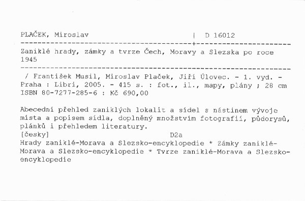 | Název | Zaniklé hrady, zámky a tvrze Čech, Moravy a Slezska po roce 1945 |
