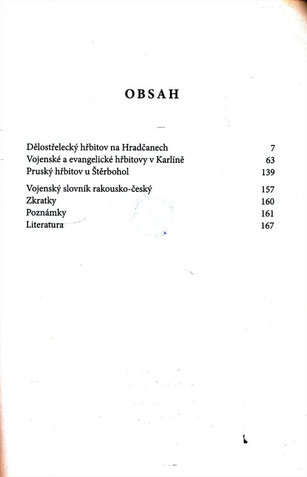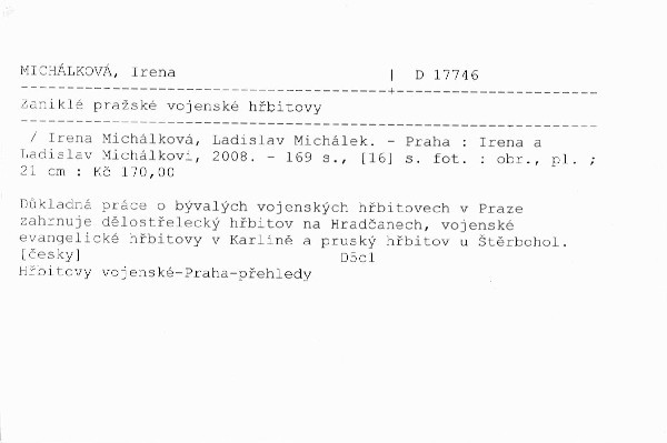 Důkladná práce o bývalých vojenských hřbitovech v Praze zahrnuje dělostřelecký hřbitov na Hradčanech, vojenské evangelické hřbitovy v Karlíně a pruský hřbitov u Štěrbohol.