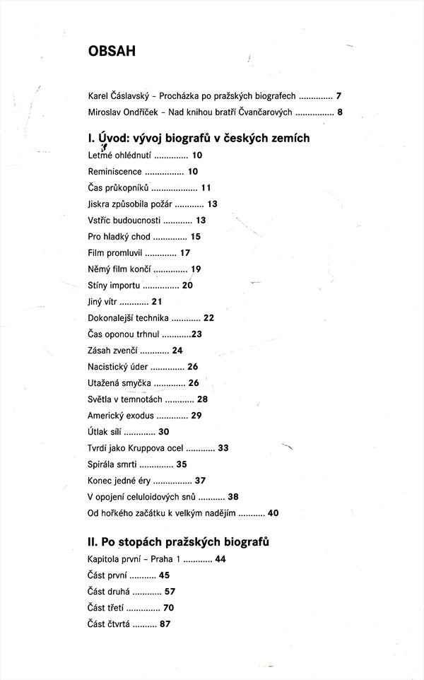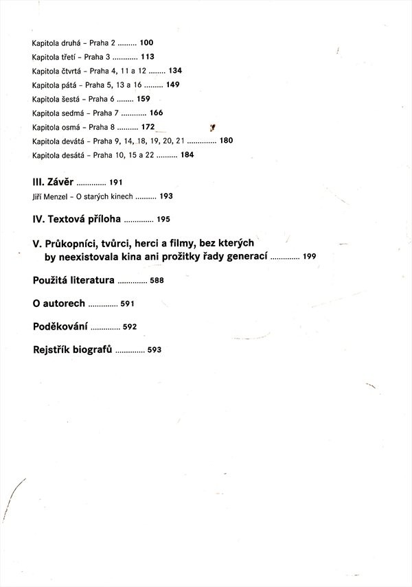 Rozsáhlá publikace je rozděla do několika kapitol. První je sondou do vzniku a počátků kinematografie a kin ve světě i u nás. Zachycuje také vývoj technických zařízení. Popisován je též stav kinematografie během 2. světové války a těsně po ní. Druhá kapitola je věnována vzniku a rozšíření biografů v Praze, a to od Prahy 1 po Prahu 10. Texty o kinech popisují z architektonického hlediska budovu a technickou vybavenost kin (počet sedadel, promítací techniku). Leckde je zmíněn provozovatel kina a je popsána jeho kariéra u filmu. Autoři také uvádějí repertoár filmových snímků, které bio uvádělo. Někde je osud kina popsán až do jeho uzavření, např. v 90. letech 20. století. Zmíněna jsou i multikina, která v Praze začala vznikat od 90. let. Poslední kapitola je nejrozsáhlejší a má dokumentární a obrazový charakter. Najdeme zde historické snímky biografů, lidí od filmu, herců, ale i kopie dobových plakátů a programových letáků. V závěru rejstřík biografů a bibliografie.