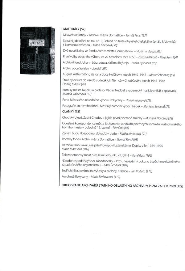 Ročenka bilancuje celoroční práci (r. 2009) jednotlivých archivních pracovišť západočeského kraje zejména v oblasti vedení evidence archiválií a vědeckovýzkumné činnosti v oboru archivnictví, pomocných věd historických a regionálních dějin.
