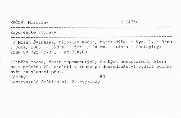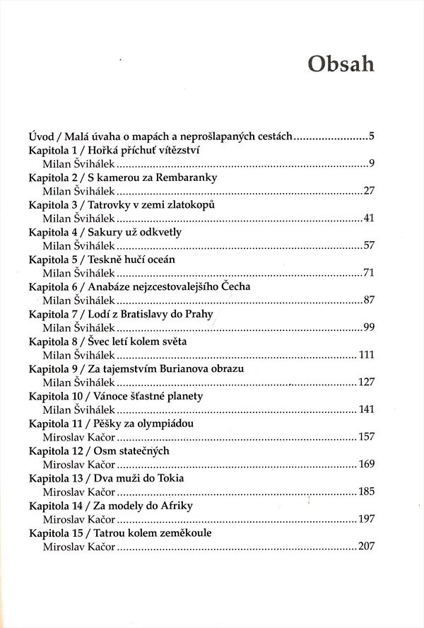 Publikace dokumentuje cesty často úplně neznámých či zapomenutých českých cestovatelů a dobrodruhů, ale též osob či výprav, které jsou dodnes pojmem. Čtenář se setká s příběhem muzikanta Eduarda Ingriše, osamělého mořeplavce Richarda Konkolského, či zapomenutého českého dobrodruha Adolfa Parlesáka. Seznamí se s dívčí pěší výpravou z Prahy do Mexika či s cyklistickou cestou kolem světa. Vypravíme se za českými potápěči, speleology, nadšenými a odvážnými vodáky nebo letci. Vzpomínka je věnována i těm, kteří svou tvorbou nebo výzkumem zachytili život a zvyky domorodců (osudy sochaře F.V. Foita v Africe, příběh etnologa Václava Kozáka v Brazílii). Kniha je bohatě doplněna fotografiemi.