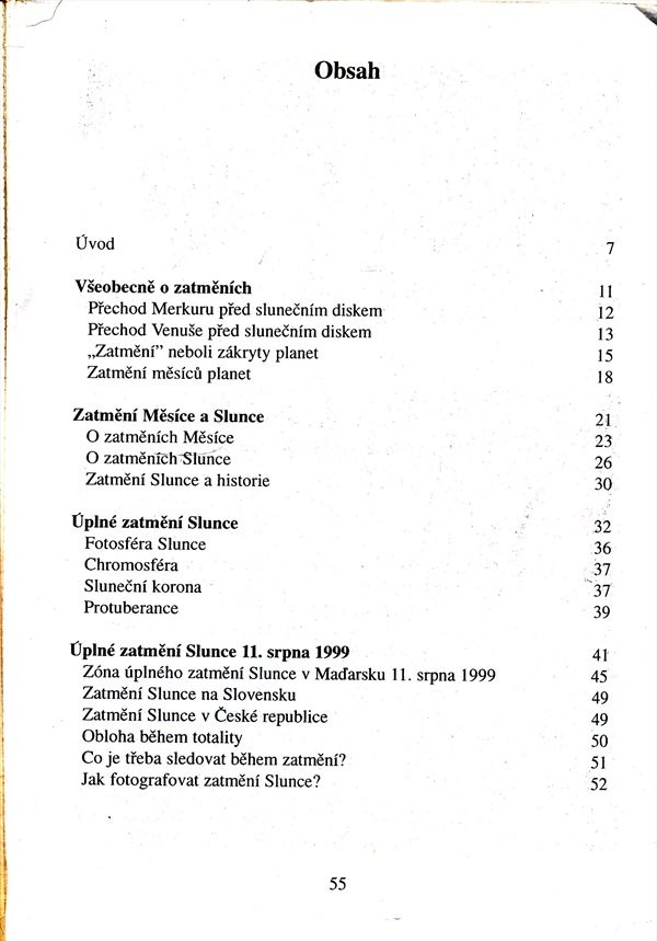 Kniha přináší astronomické informace, ale také zachycuje historii zatmění Slunce, včetně popisu reakcí lidí na tento neobyčejný jev. Největší prostor je věnován popisu zóny úplného zatmění Slunce v roce 1999, vymezení časového rozmezí zatmění a samozřejmě také objasnění situace částečného zatmění Slunce, jak bude pozorovatelné u nás v ČR a na Slovensku. V publikaci nechybějí ani prakticky zaměřené kapitoly o pozorování zatmění a obecné návody na fotografování tohoto úkazu. Prakticky orientovaná, velmi stručná publikace s barevnými fotografiemi zatmění Slunce a mapkami zóny zatmění je vhodná především pro laiky, kteří se potřebují rychle zorientovat v dané problematice. 23.7.1999 Kruš.