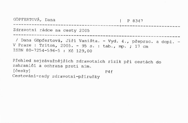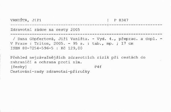 Brožura upozorňuje na rizika, která mohou turisty potkat při zahraničních cestách (nadměrné slunění, úrazy, infekce...). Praktické rady před cestou, během cesty a po návratu. Seznam léků pro vybavení cestovní lékárničky. Informace o zdravotním pojištění při cestách do zahraničí.