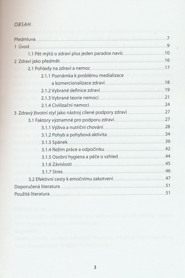 Studijní text určený pro studenty oboru Vychovatelství a Pedagog volného času se zabývá současným pojetím zdraví a nemoci, věnuje se výživě, pohybovým aktivitám, spánku, time managementu a nadějným způsobům emočního zakotvení.
