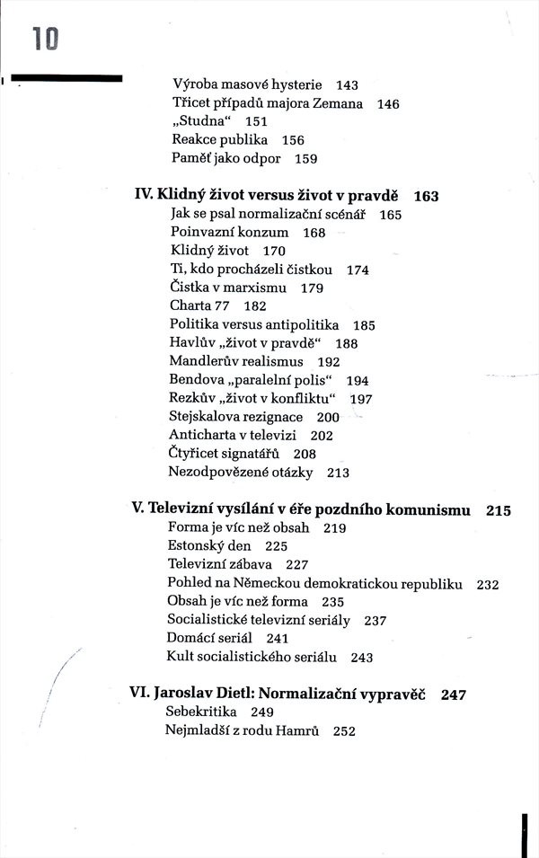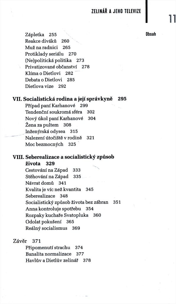 Práce líčí kvas čs. společenosti v 60. letech 20. století, invazi vojsk pěti států Varšavské smlouvy, počátky normalizace, prověrky členů komunistické strany, snaží se o charakteristiku protagonistů normalizace, sleduje využití vlivu Československé televize tehdejším režimem, pokouší se o podrobnější charakteristiku televizních seriálů natočených podle scénáře J. Dietla (Žena za pultem, Nemocnice na kraji města) a nevynechává ani seriál o majoru Zemanovi. Text se rovněž snaží zmapovat ohlas a oblibu těchto seriálů u televizních diváků. Zachycuje též tehdejší politický a společenský vývoj. Kniha je založena na archivních pramenech a literatuře.