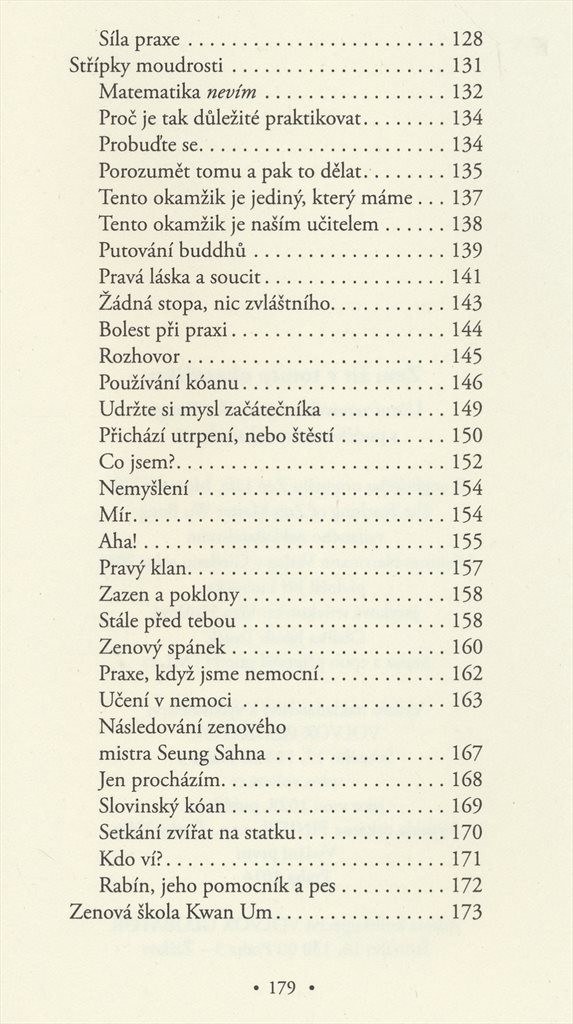 První část textu přináší osobní příběhy učitelů a studentů školy Kwan Um, druhá část přináší formální řeči dharmy, pronesené při různých příležitostech, ve třetí části najdete odpovědi zenového mistra na otázky studentů, čtvrtá část je rozhovor.