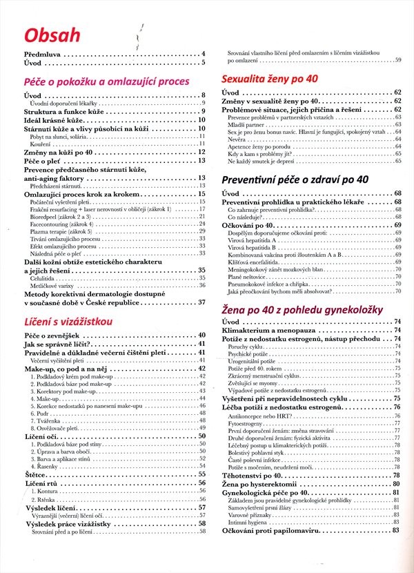 Věnuje se péči o kůži, metodě omlazujícího procesu, líčení jednotlivých typů obličeje. Zdravotní problematice, preventivním prohlídkám, které jsou vhodné po 40 absolvovat. Nechybí seznámení se základy zdravé výživy, denní stravovací režim, celodenní jídelníčky, 18 anti-aging kuchařských receptů. Návody ke zdravému cvičení, sestava aktivující jednotlivé svalové skupiny. Rady, co by měl obsahovat šatník zralé ženy, včetně fotografií.