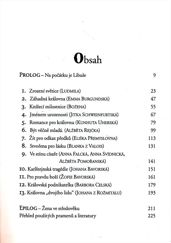 Knížka nabízí životopisné medailony šestnácti žen, které usedly po boku svých manželů na český knížecí či královský trůn a často zanechaly výraznou stopu v české historii. Chronologicky uspořádaný výklad otevírá kapitola věnovaná bájné kněžně Libuši, poslední kapitola přibližuje život a působení Johany z Rožmitálu, manželky krále Jiřího z Poděbrad. Prostřednictvím příběhů těchto žen a osudů jejich knížecích a královských manželů předkládá autor ucelený obraz dějin českého knížectví a království v období středověku.