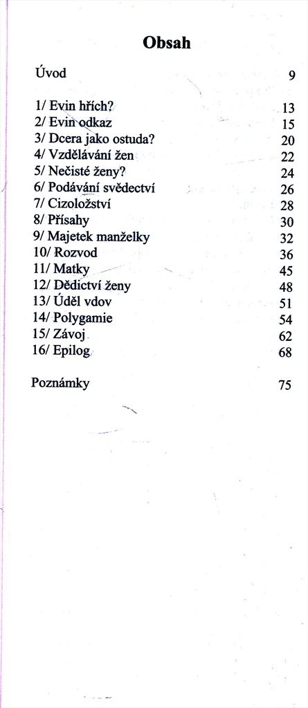 Postavení ženy v těchto náboženstvích, jež lze definovat mimo jiné jejími právy, privilegii a odpovědnostmi, je patrně jedním z nejnepochopenějších a nejzkreslenějších, nicméně nejdiskutovanějších témat ve vztahu k ženám - a to platí zejména pro mýty provázející postavení muslimské ženy. Text nám s nebývalou logikou a výmluvností nabízí komparativní analýzu judaismu, křesťanství a islámu v celé škále témat souvisejících se ženami. Pro její správné posouzení je nutné si uvědomit, že židovsko-křesťanský odkaz je třeba hodnotit s ohledem na jeho odpovídající historický kontext. Nakladatelská anotace. Kráceno.