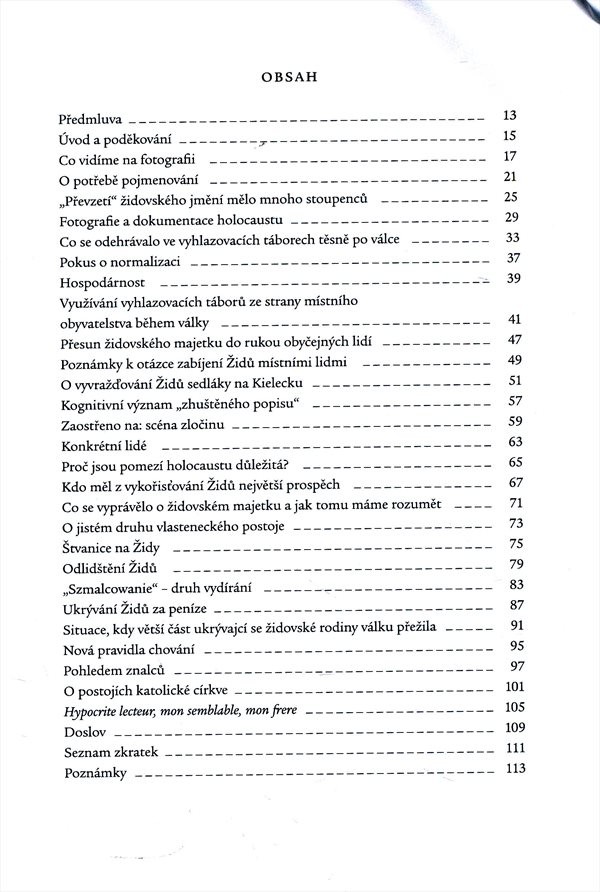 Autor popisuje zoufalou situaci polských Židů za druhé světové války - často byla jejich jedinou nadějí na záchranu před nacistickým pronásledováním pomoc domácího obyvatelstva. Místní však nezřídka využili přiležitosti, kterou vytvořily dějiny, k vlastnímu obohacení. Kniha přibližuje tragické okolnosti přejímání židovského majetku, které bylo doprovázeno chamtivostí a někdy vysloveně kriminálními činy (vydírání, nelidské zacházení, vraždy). Autor, který vychází ze vzpomínek pamětníků, memoárové literatury, vyšetřovacích spisů a dalších pramenů, dochází k závěru, že výše uvedené události (loupení židovského majetku doprovázené kriminální činností i poválečná snaha se obohatit na tragickém osudu Židů) nebyly ojedinělé a nebyly spáchány pouze lidmi z okraje společnosti. - K napsání knížky autora inspirovala historická černobílá fotografie z Treblinky, publikovaná v roce 2008: je na ní zobrazena skupina venkovanů a uniformovaných mužů, před kterými jsou shromážděny lidské ostatky.