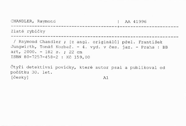 | Autor | Raymond Chandler ; [z angl. originálů] přel. František Jungwirth, Tomáš Korbař |