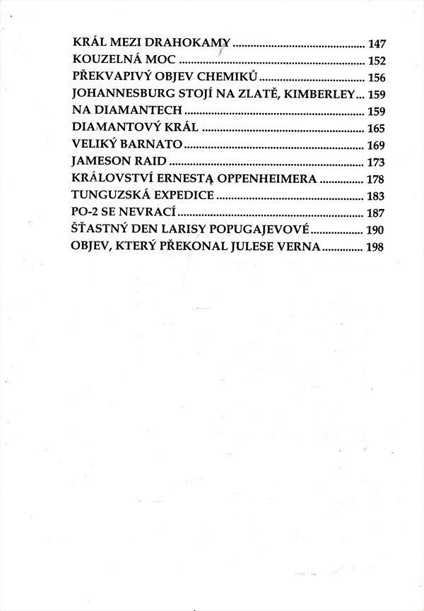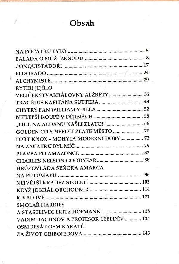 V prvních kapitolách se autor věnuje činům španělských conquistadorů a anglických pirátů. Nepomine ani snahy alchymistů vytvořit zlato z jiných kovů. Další část knihy odhaluje počátky využívání přírodního kaučuku, vznik gumárenkého průmyslu i vynález kaučuku syntetického. Třetí část knihy mapuje dějiny lidské honby za nejdražšími a vůbec nejvzácnějšími nerosty s mimořádnou tvrdostí - za diamanty.