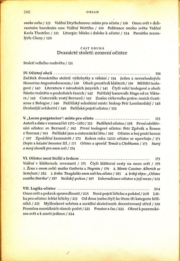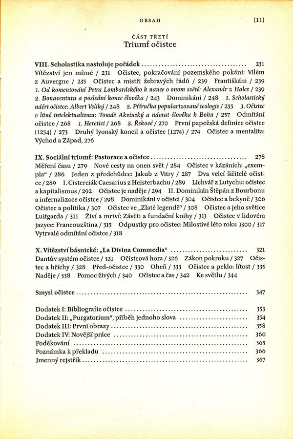 Jde o rozbor otázky, kterou středověké křesťanství kladlo na první místo - věčná otázka viny a trestu a v souvislosti s tím i spásy a zatracení, smrti a nesmrtelnosti. Časově se jedná o 11. - 12. století; autor se ale vydává k představám posmrtného života až do starověku - Indie, Íránu, Egypta i k imaginacím antického světa. Zabývá se přístupem židovství k této otázce a k počátkům křesťanství, kdy pojem poprvé vyslovil a definoval představitel patristiky - Augustin. Doktrina očistce pak vykrystalizovala v 11. a zejména ve 12. stol. v představu očistného ohně a zároveň předstupně věčných pekelných muk. Autor se pak zabývá vztahem scholastické filozofie k této otázce a snahou církve včlenit institut očistce do věrouky. Sleduje i to, co nazývá "triumfem" očistce - právě jeho potvrzení v díle Tomáše Akvinského, v pastoračních kázáních i v dílech uměleckých (Dante). Zároveň si ale všímá, jak v souvislosti s vystoupením heretiků nabyla otázka očistce silně konfliktního akcentu. Rozborem Dantovy Božské komedie a symbolickým výstupem na jeho očistcovou horu autor končí své dějiny očistce ve středověkém křesťanství. Závěrečná nedlouhá kapitola se zamýšlí nad úlohou morální očisty v našem současném světě, kdy zpochybněno už bylo úplně všechno a cesta ke světlu se změnila v naprostý chaos. - Text je doplněn mnoha citáty z příslušných soudobých textů. Český překlad monografie je dokonalý, stejně jako se vzácnou citlivostí zvolené překlady vybraných básnických i biblických textů. Doplněno dodatky k textu a obsáhlým jmenný rejstříkem.