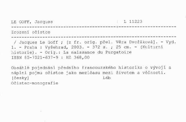 Obsáhlé pojednání předního francouzského historika o vývoji a náplni pojmu očistce jako mezičasu mezi životem a věčností.