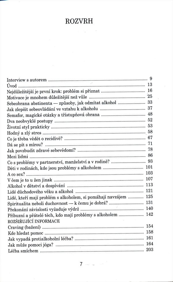Kniha, která je rozšířenou verzí starší Nešporovy publikace, je určena širokému čtenářskému okruhu - lidem, kteří mají problémy s alkoholem, jejich rodinám a přátelům, popř. i jejich terapeutům. Ukazuje, kde hledat pomoc a vysvětluje, jak mohou probíhat různé typy léčby. Text je psán čtivě, srozumitelně a jasně. Je doplněn mnoha materiály, příběhy z autorovy praxe, instruktážními fotografiemi pro cvičení jógy, články z tisku, básničkami a karikaturami Vladimíra Jiránka.
