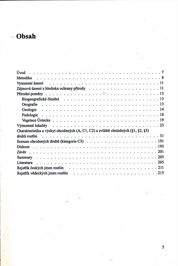 Odborná publikace je určena nejen profesionálům, ale i laickým zájemcům o květenu. Práce se zabývá především výskytem ohrožených a zvláště chráněných druhů cévnatých rostlin, které byly popisovány v minulosti i současnosti na území okresu Ústí nad Labem. Vedle výskytu současných i historických lokalit je u každého druhu uveden i krátký morfologický popis a stručná ekologická charakteristika, která vychází z pozorování v regionu. Pro odbornou veřejnost má velký význam i floristická bibliografie Ústecka.